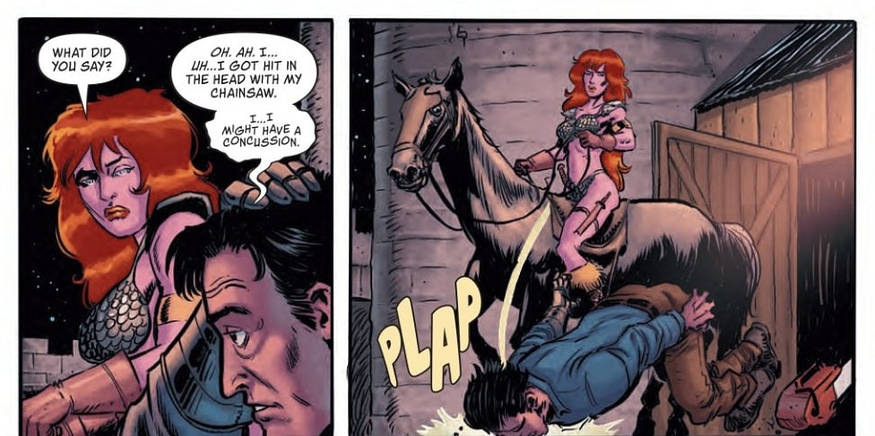 I've really enjoyed my foray into sword and sorcery over the past year, but I still haven't fallen in love with Red Sonja. I've read a few comics and even bought the audiobook for Gail Simone's novel, Consumed, but I just haven't connected with the character yet. I don't mind her; I just don't find her all that interesting. But when I saw her on the front cover next to Ash Williams, I just had to know what was inside. So, I snagged both issues released thus far and added the remainder of the run to my pull list. Then I went home and got reading.